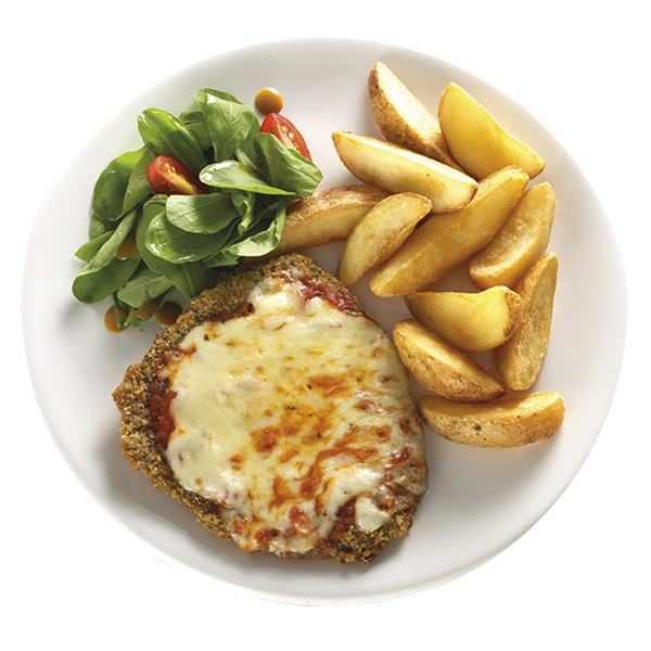 Milanesa de peceto horneada, salsa de tomate, mozzarella, papas al horno.