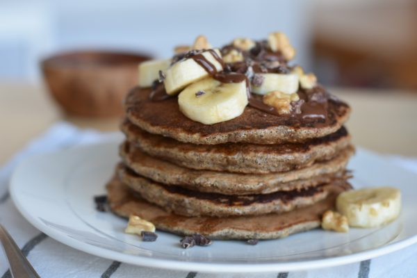 Pancakes de Avena activada y harina de trigo ingregral sarraceno con Chocolate de Bygiro.