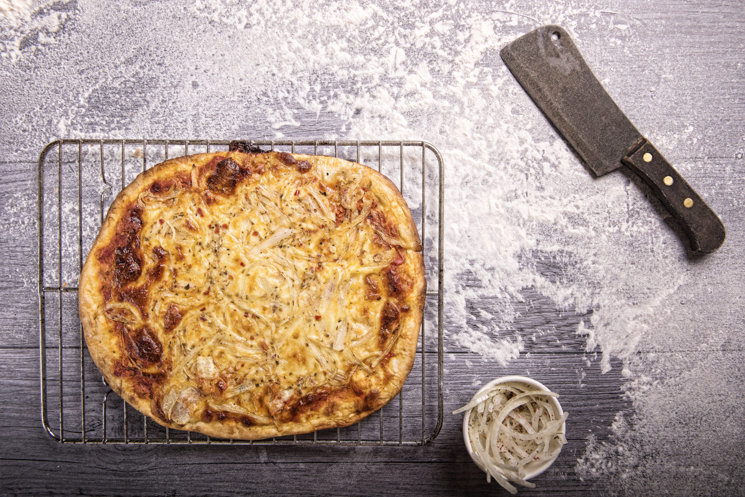 Salsa de tomates, muzzarella y cebolla