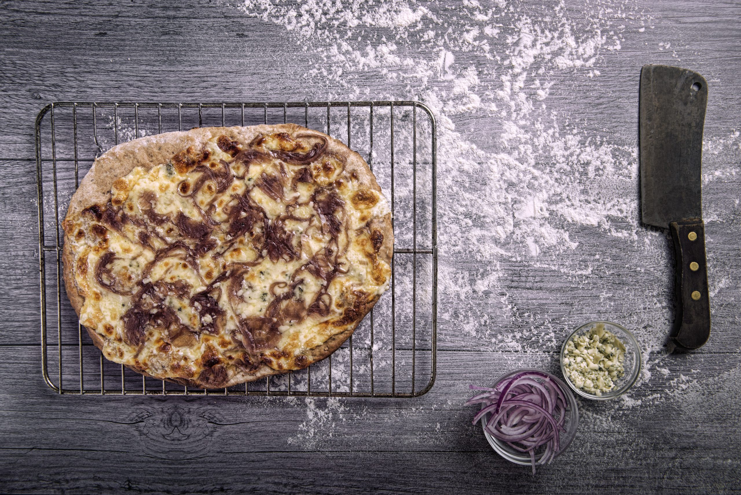 Pizza a la parrilla INTEGRAL de mermelada de cebolla y queso azul Ifrozen